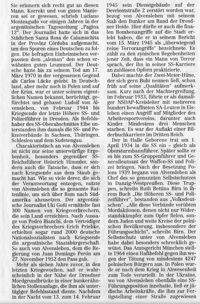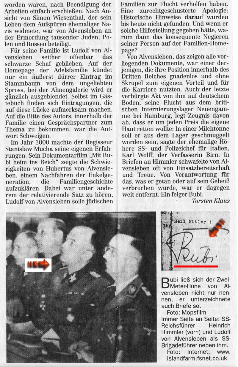 Bubi-Thematik ein Vor-Vor-Besitzer des Grundstückes WachbergStr. 37 war Ludolf von Alvensleben, genannt Bubi nachfolgend bringe ich mal 2 ZeitungsArtikel, die sich mit dem Bubi befassen a) der erste ist von 11.02.1972 und stammt von Walter Weidauer, dazumal Oberbürgermeister von Dresden b) der zweite ist vom 13.06.2005 und stammt von einem Historiker/Journalisten c) als drittes wäre da noch ein Film über Viktor Klemperer, einen dresdner Juden ich habe es so in Erinnerung > in diesem Film über Viktor Klemperer wird u.a. gezeigt wie ein hoher SS-Führer persönlich das Klemperer-Grundstück inspiziert und Gegenstände in Beschlag nimmt, von denen er einige garantiert auch nach seinem Grundstück rüber-bringen (vom Weißen Hirsch über die Senke GrundStrasse rüber nach Oberloschwitz) läßt. d) und viertens ist da eine ZDF-info Sendung vomm 21.März 2014 SendungsName: Die Kinder der Herrenrasse "Organisation Lebensborn" Bubi hat danach ein Lebensborn-Kind gezeugt > Name: Guntram Weber nach Walter Weidauer hat der Bubi hier in den Jahren 1934 + 35 bzw bis 45 gelebt. für mich liegt die Vermutung nahe, dass seine Angehörigen erst im Frühjahr 1945 dieses Grundstück in Richtung Westen verlassen haben. Begründen tut sich das u.a. für mich mit folgenden Fakten; von alteingesessenen Oberloschwitzern wurde uns beim Einzug berichtet, dass vorn am Grundstück-EingangsTor mal ein Postenhaus stand, das erklärt auch eine Beton-Bodenplatte, an die ich mich hier erinnern kann und es gab eine Telefon-Verbindung zwischen GartenTor und dem EingangsFlur des Hauses, diese Telefone waren zwar stark verschlissen, aber sie waren physisch 1968 noch da. was ich damit sagen will, in diesem Grundstück waren mit ziemlicher Sicherheit WertGegenstände konzentriert. nach Stalingrad werden die Bewohner angefangen haben sich Gedanken zu machen, spätestens aber ab Ende 44 und dann natürlich auch Aktionen um ihre Habe gut zu verstecken erst viel später, wo's dann für mich nicht mehr da war (das Grundstück), habe ich überlegt wo ... und da sind dann auch ein paar Erleuchtungen gekommen, Erklärungen für bestimmte Sachverhalte aber das nehme ich jetzt mit ins NIRWANA hier ist mir höchstwahrscheinlich ein weiteres (neben dem Grundstück) Vermögen durch die Lappen gegangen. und dabei habe ich seit dem Weidauer-Artikel 1972 gewußt, was für ein VorBesitzer hier mal gelebt hat /ich hätte mich statt mit dem TO10 FVB in 13 Jahren nur e i n m a l ernsthaft mit dieser Grundstücks-Geschichte befassen müssen, um auf die Spur zu kommen bzw nicht mal das hat mich dazu angehalten, an diesem Grundstück festzuhalten. ich wälze das hier so aus, weil es ein markantes Beispiel dafür ist, dass es mit meiner Einstellung zu Besitz und Vermögen nie weit her war. jetzt werden wohl die meisten so denken > ... ein hoffnungsloser Fall von nicht zu übertreffender Dummheit /übrigens, dieser Walter Weidauer war auf dem Altmarkt 13 III.Etg unser direkter WhgsNachbar bis zum GrundstücksKauf im Jahre 1968 |