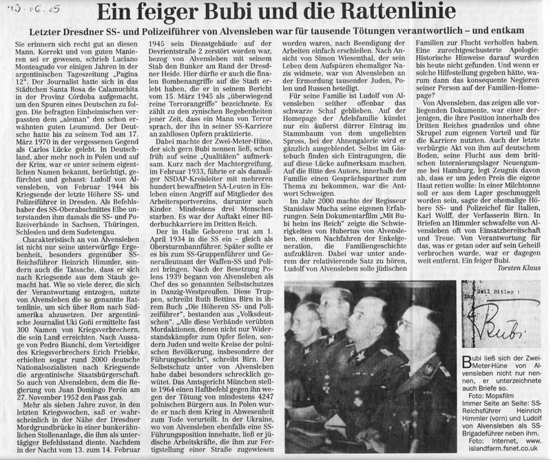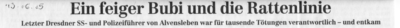 Bubi-Thematik ein Vor-Vor-Besitzer des Grundstückes WachbergStr. 37 war Ludolf von Alvensleben, genannt Bubi nachfolgend bringe ich mal 2 ZeitungsArtikel, die sich mit dem Bubi befassen a) der erste ist von 11.02.1972 und stammt von Walter Weidauer, dazumal Oberbürgermeister von Dresden b) der zweite ist vom 13.06.2005 und stammt von einem Historiker/Journalisten c) als drittes wäre da noch ein Film über Viktor Klemperer, einen dresdner Juden ich habe es so in Erinnerung > in diesem Film über Viktor Klemperer wird u.a. gezeigt wie ein hoher SS-Führer persönlich das Klemperer-Grundstück inspiziert und Gegenstände in Beschlag nimmt, von denen er einige garantiert auch nach seinem Grundstück rüber-bringen (vom Weißen Hirsch über die Senke GrundStrasse rüber nach Oberloschwitz) läßt. d) und viertens ist da eine ZDF-info Sendung vomm 21.März 2014 SendungsName: Die Kinder der Herrenrasse "Organisation Lebensborn" Bubi hat danach ein Lebensborn-Kind gezeugt > Name: Guntram Weber nach Walter Weidauer hat der Bubi hier in den Jahren 1934 + 35 bzw bis 45 gelebt. für mich liegt die Vermutung nahe, dass seine Angehörigen erst im Frühjahr 1945 dieses Grundstück in Richtung Westen verlassen haben. Begründen tut sich das u.a. für mich mit folgenden Fakten; von alteingesessenen Oberloschwitzern wurde uns beim Einzug berichtet, dass vorn am Grundstück-EingangsTor mal ein Postenhaus stand, das erklärt auch eine Beton-Bodenplatte, an die ich mich hier erinnern kann und es gab eine Telefon-Verbindung zwischen GartenTor und dem EingangsFlur des Hauses, diese Telefone waren zwar stark verschlissen, aber sie waren physisch 1968 noch da. was ich damit sagen will, in diesem Grundstück waren mit ziemlicher Sicherheit WertGegenstände konzentriert. nach Stalingrad werden die Bewohner angefangen haben sich Gedanken zu machen, spätestens aber ab Ende 44 und dann natürlich auch Aktionen um ihre Habe gut zu verstecken erst viel später, wo's dann für mich nicht mehr da war (das Grundstück), habe ich überlegt wo ... und da sind dann auch ein paar Erleuchtungen gekommen, Erklärungen für bestimmte Sachverhalte aber das nehme ich jetzt mit ins NIRWANA hier ist mir höchstwahrscheinlich ein weiteres (neben dem Grundstück) Vermögen durch die Lappen gegangen. und dabei habe ich seit dem Weidauer-Artikel 1972 gewußt, was für ein VorBesitzer hier mal gelebt hat /ich hätte mich statt mit dem TO10 FVB in 13 Jahren nur e i n m a l ernsthaft mit dieser Grundstücks-Geschichte befassen müssen, um auf die Spur zu kommen bzw nicht mal das hat mich dazu angehalten, an diesem Grundstück festzuhalten. ich wälze das hier so aus, weil es ein markantes Beispiel dafür ist, dass es mit meiner Einstellung zu Besitz und Vermögen nie weit her war. jetzt werden wohl die meisten so denken > ... ein hoffnungsloser Fall von nicht zu übertreffender Dummheit /übrigens, dieser Walter Weidauer war auf dem Altmarkt 13 III.Etg unser direkter WhgsNachbar bis zum GrundstücksKauf im Jahre 1968 |
